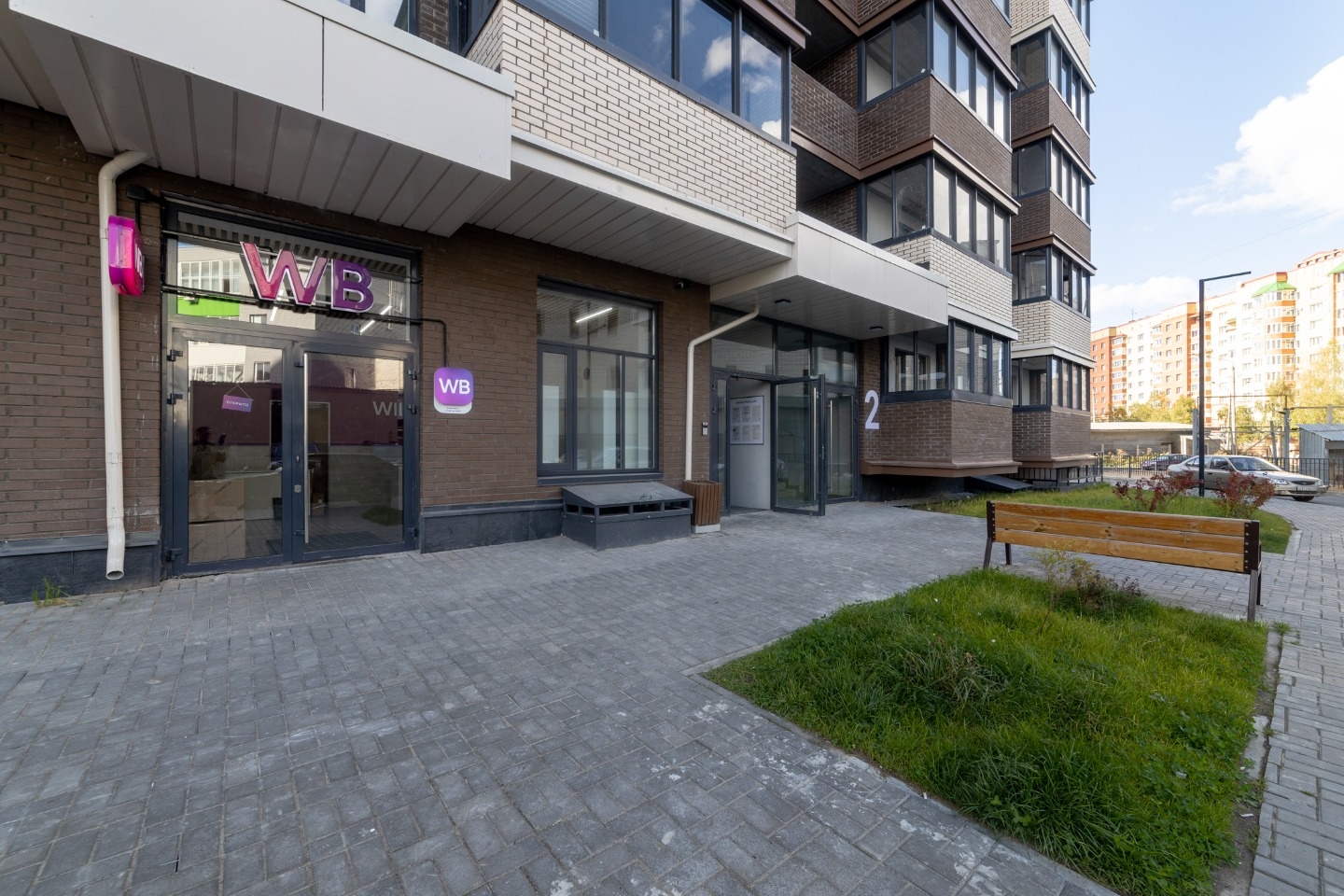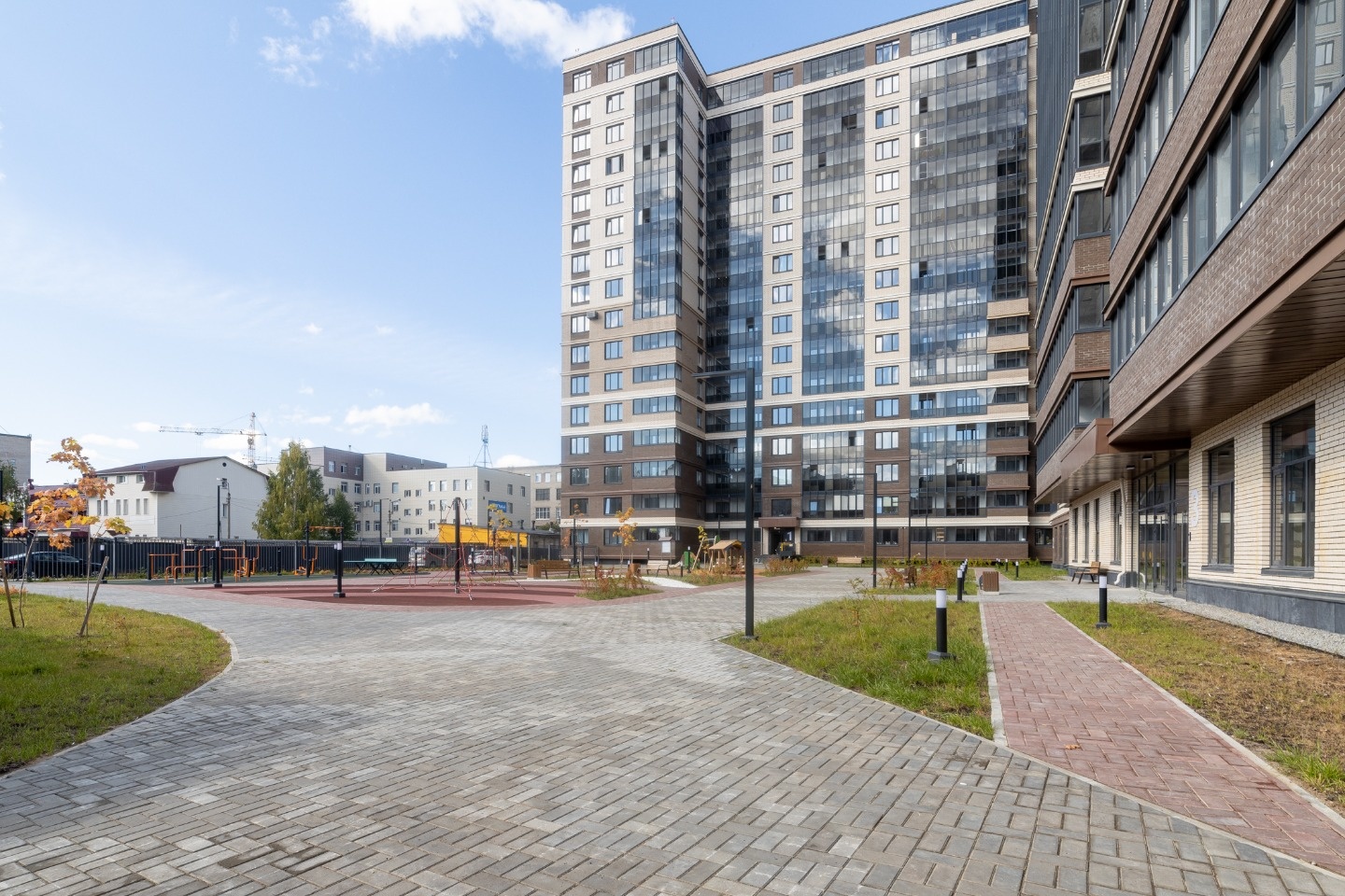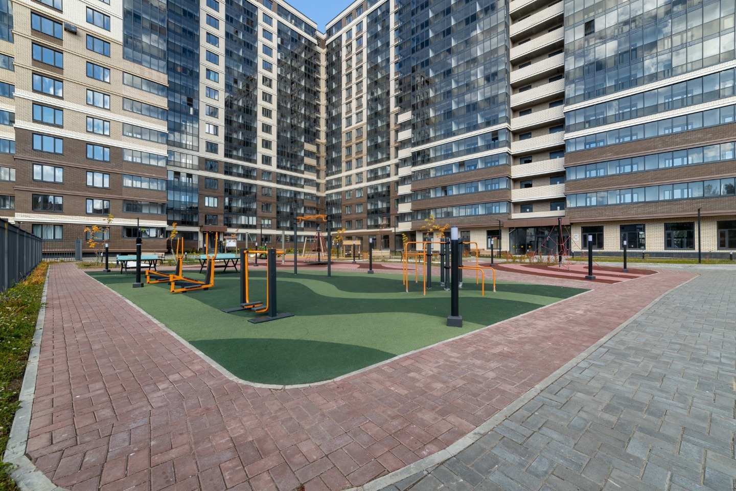• Двор: свободный от машин, с облагороженной территорией, скамейками, шезлонгами, изобилием газонов и цветников.