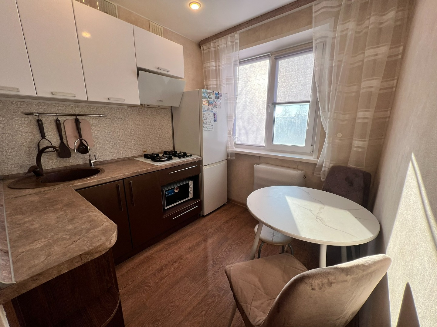 Свежий современный ремонт: Во всех помещениях установлены натяжные потолки, качественные напольные покрытия. Интерьер в светлых тонах создает ощущение пространства и чистоты.