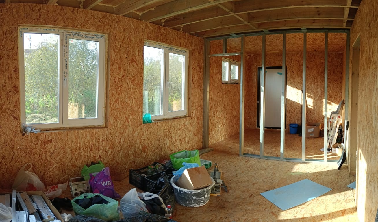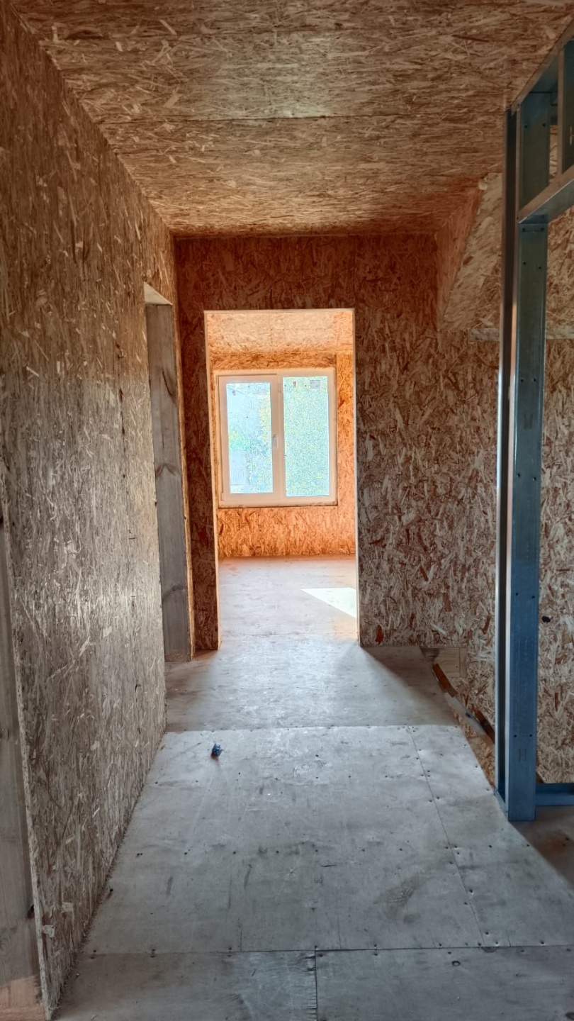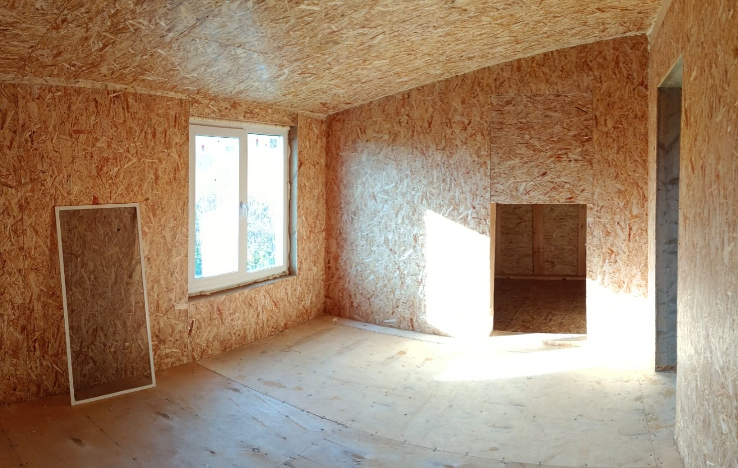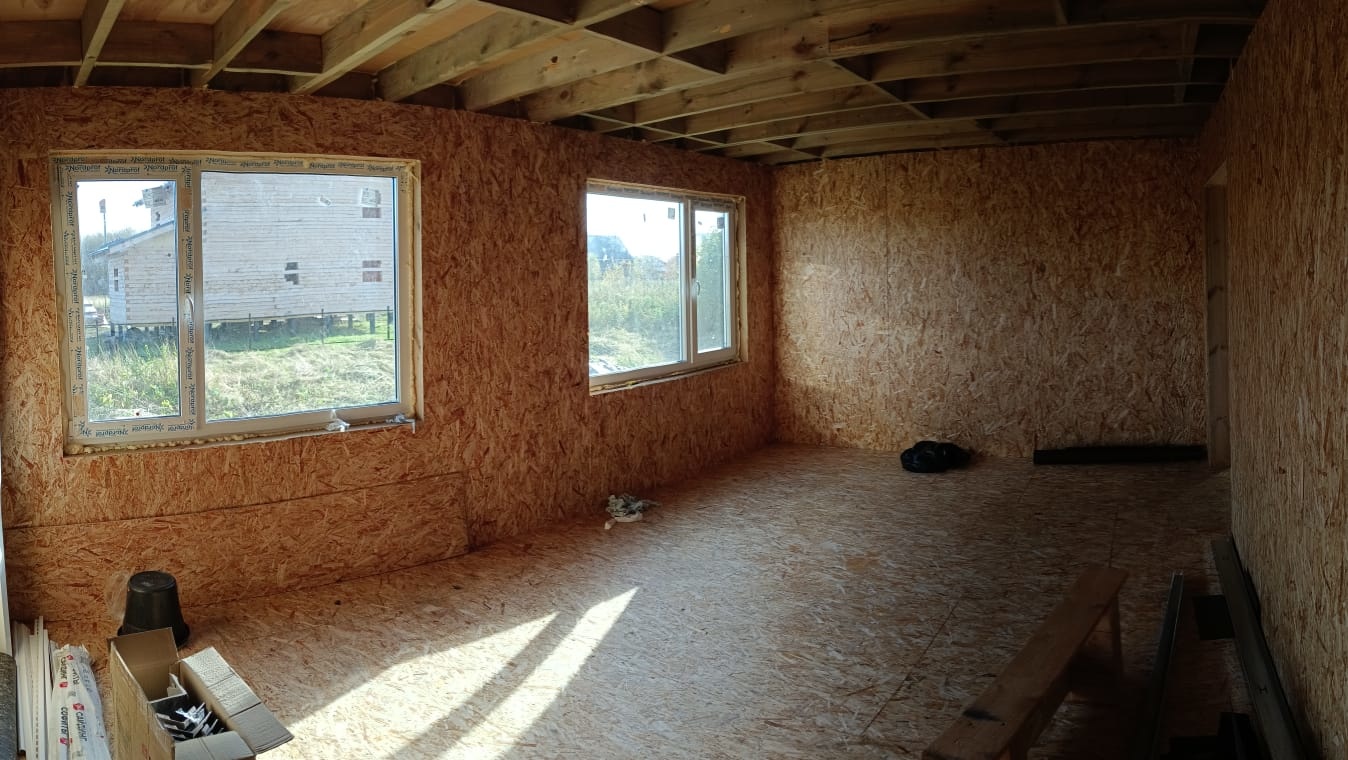 Внутри дом обшит ОСБ, установлены межкомнатные направляющие, установлена вытяжка.