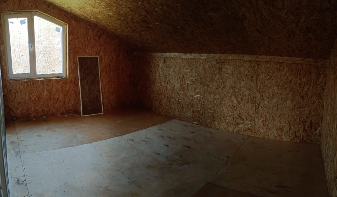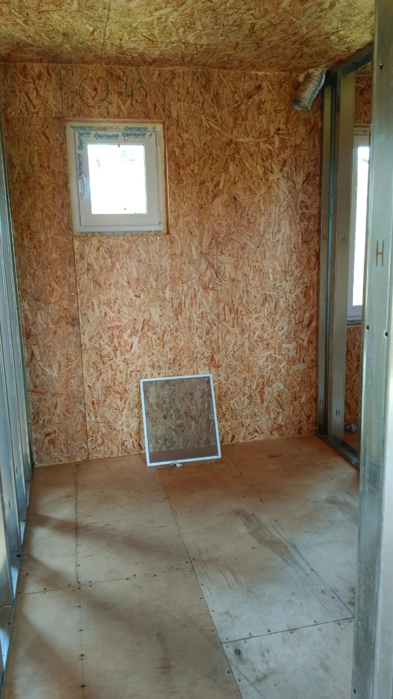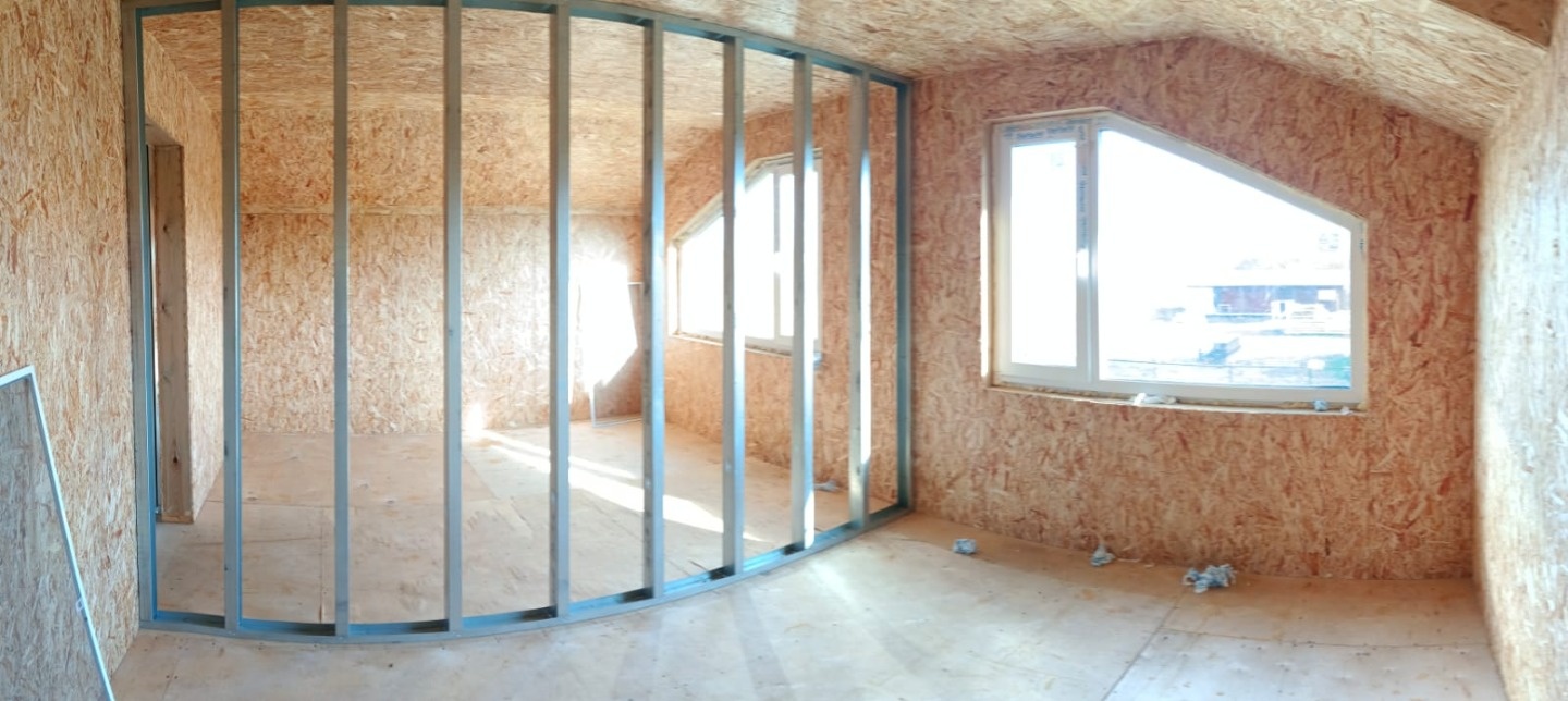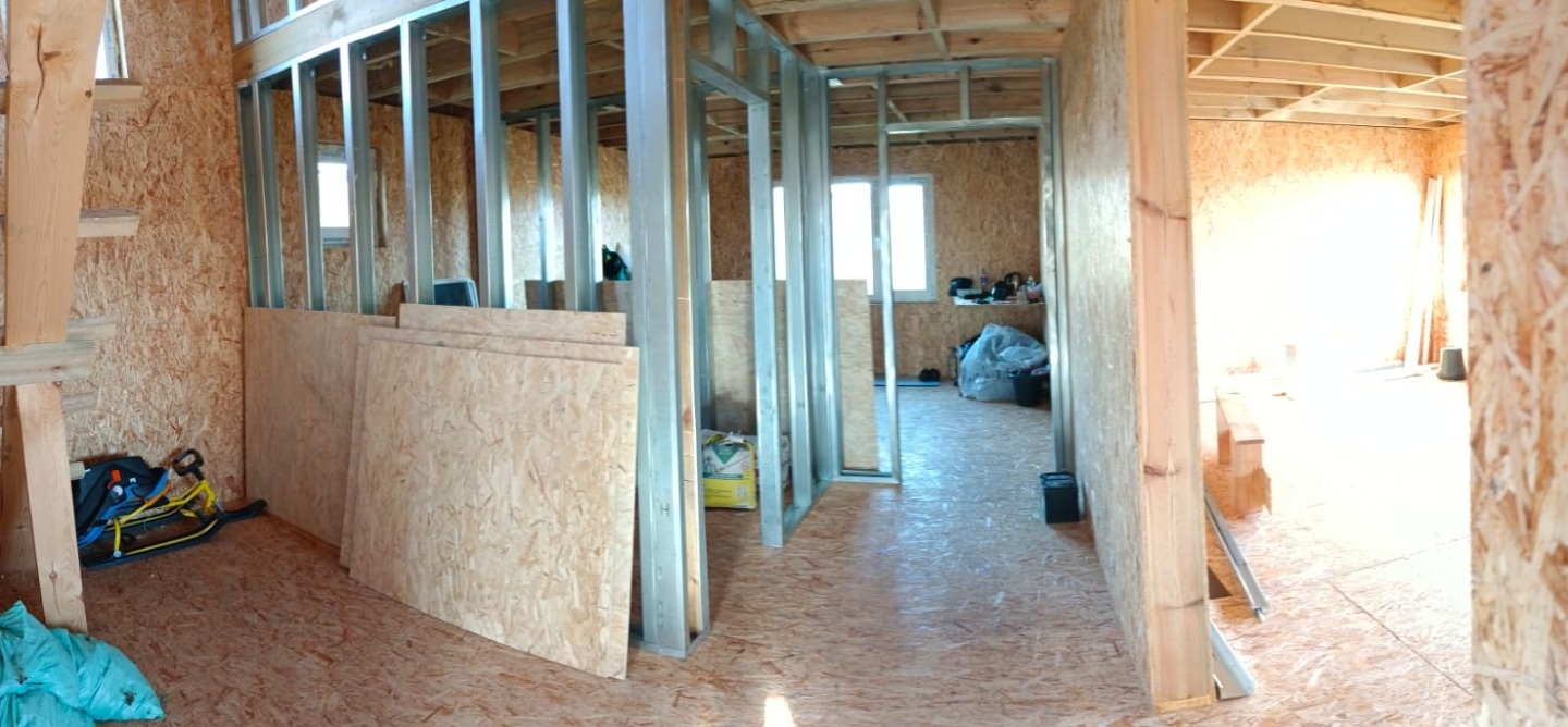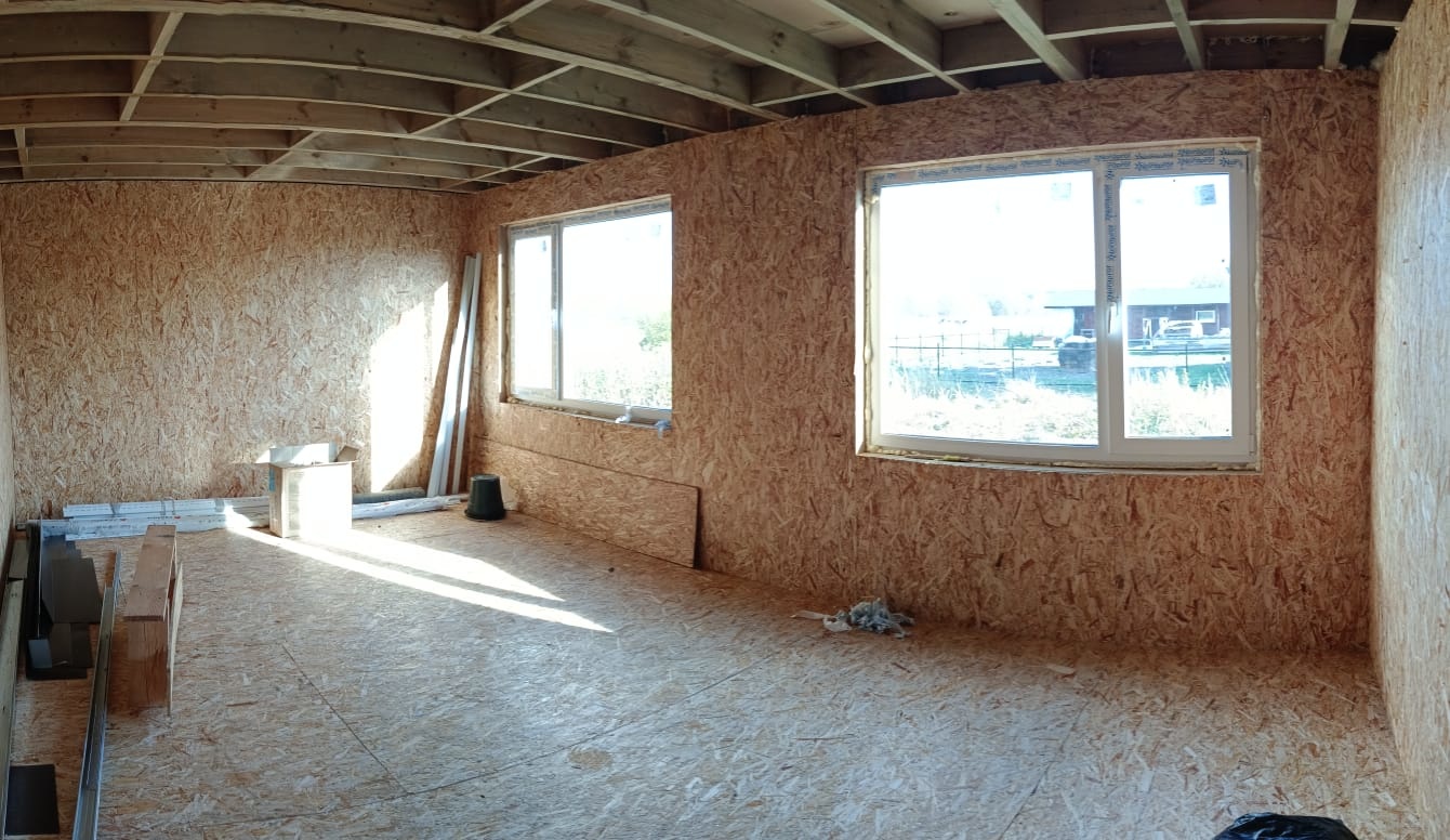 Внутри дом обшит ОСБ, установлены межкомнатные направляющие, установлена вытяжка.