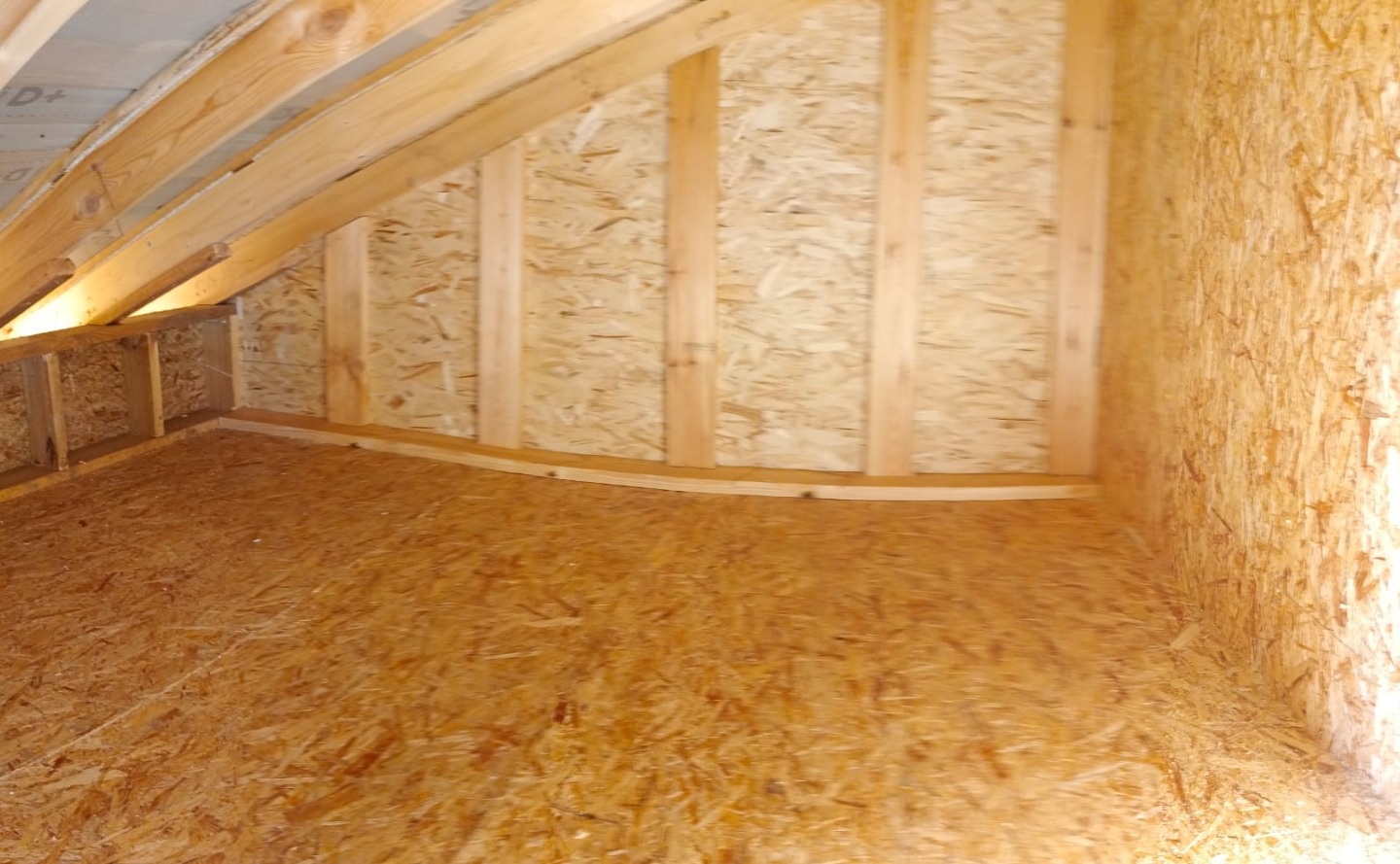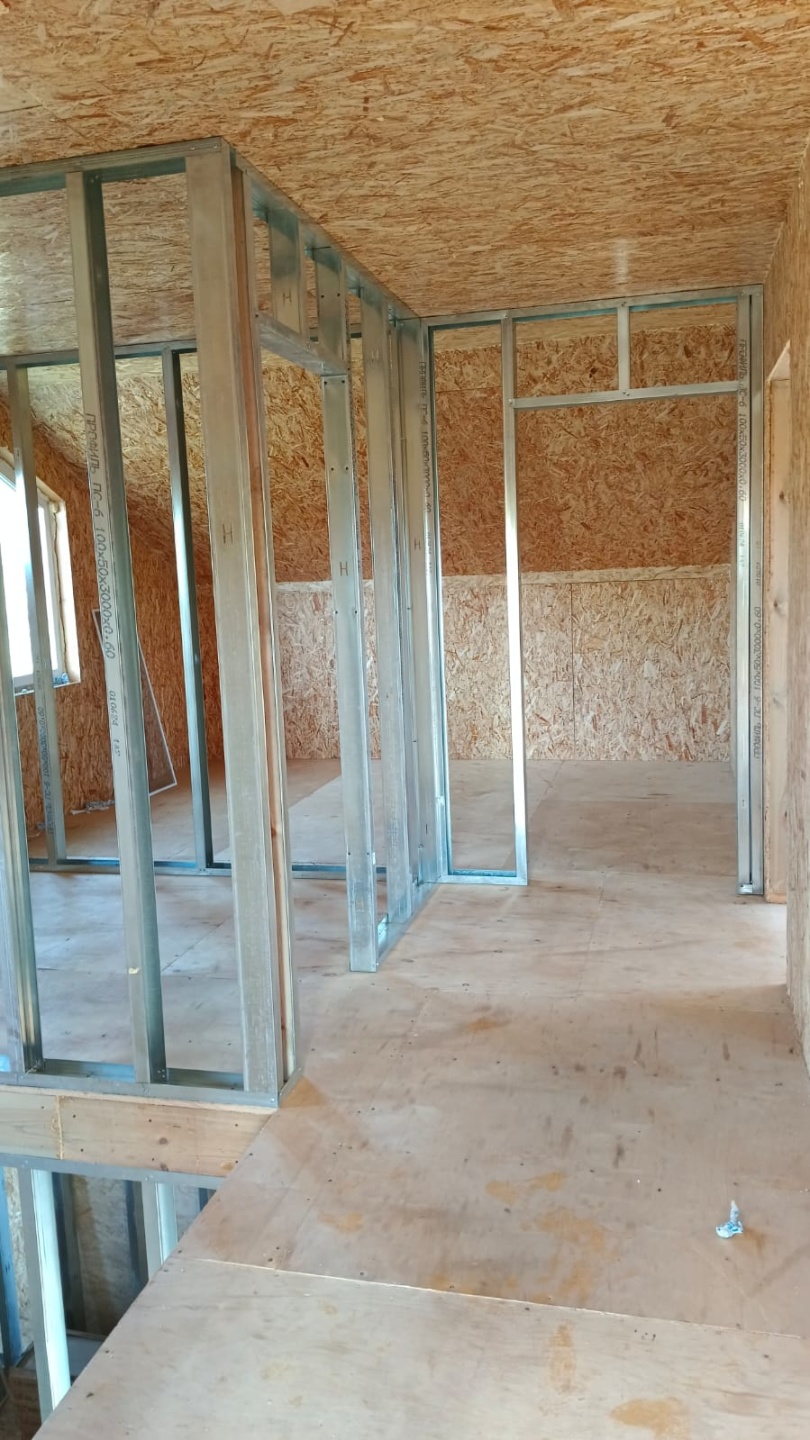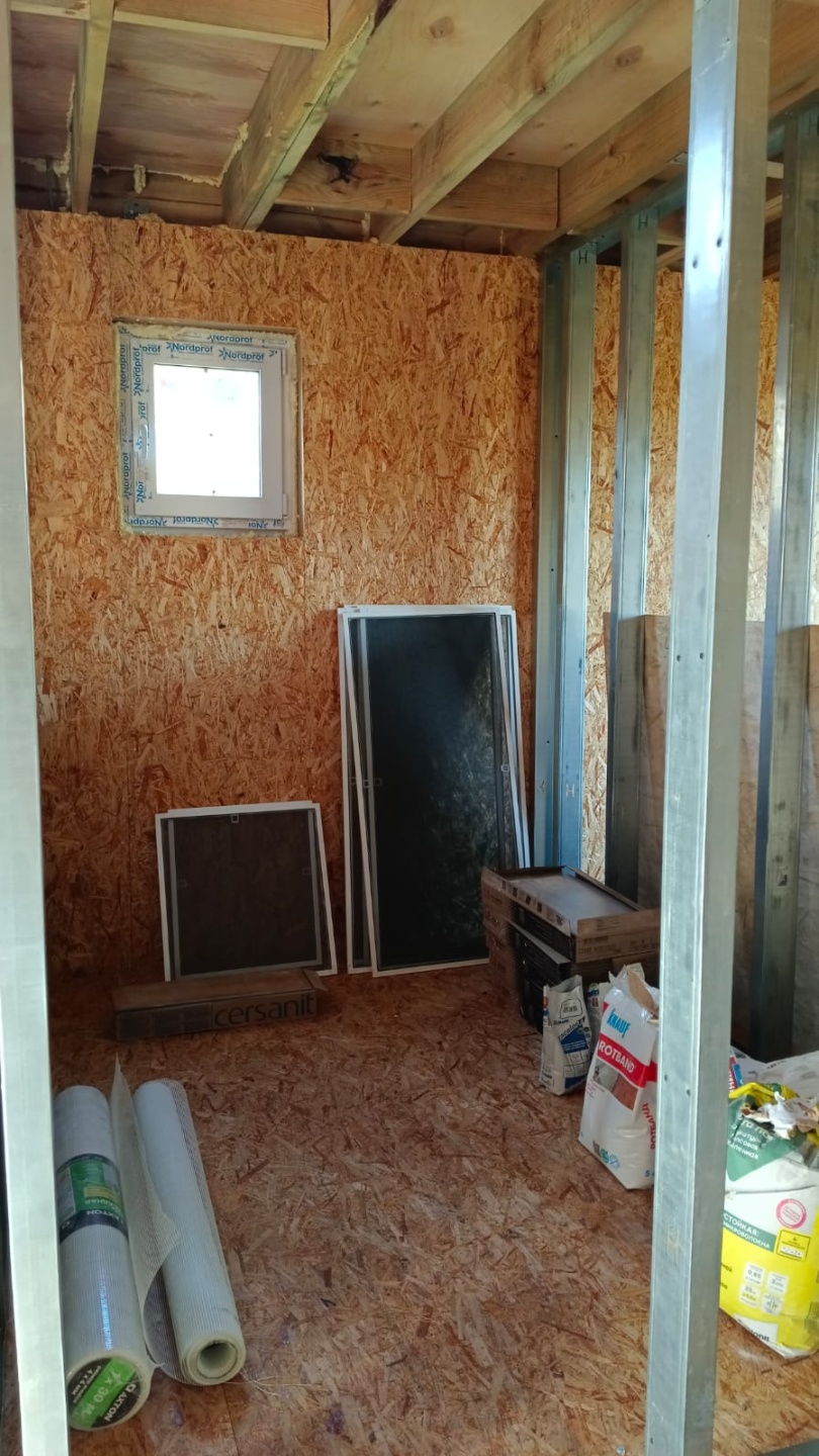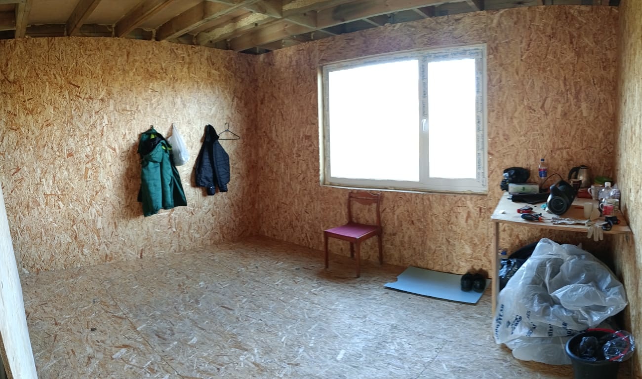 Внутри дом обшит ОСБ, установлены межкомнатные направляющие, установлена вытяжка.