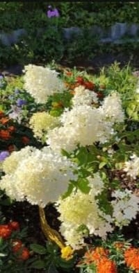 Имеются декоративные кустарники - гортензия, роза, жасмин, много многолетних цветов.